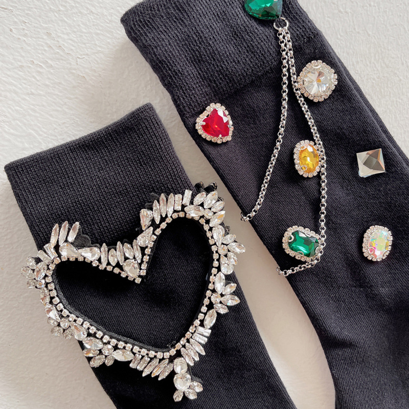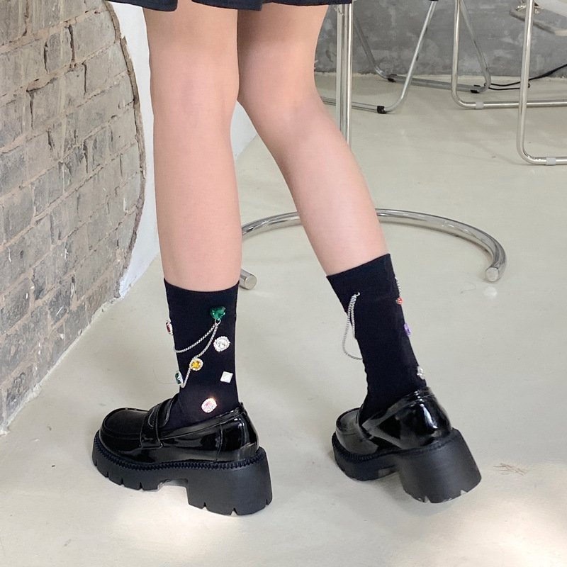 Be the first to review “Summer and Spring European Luxury Love Diamond Black Chain Middle Tube Stacked Socks”